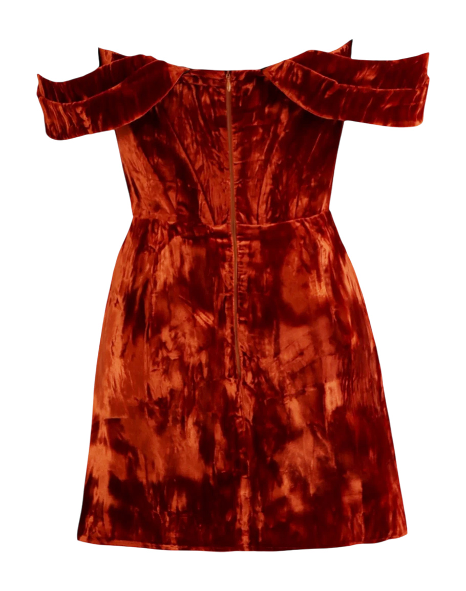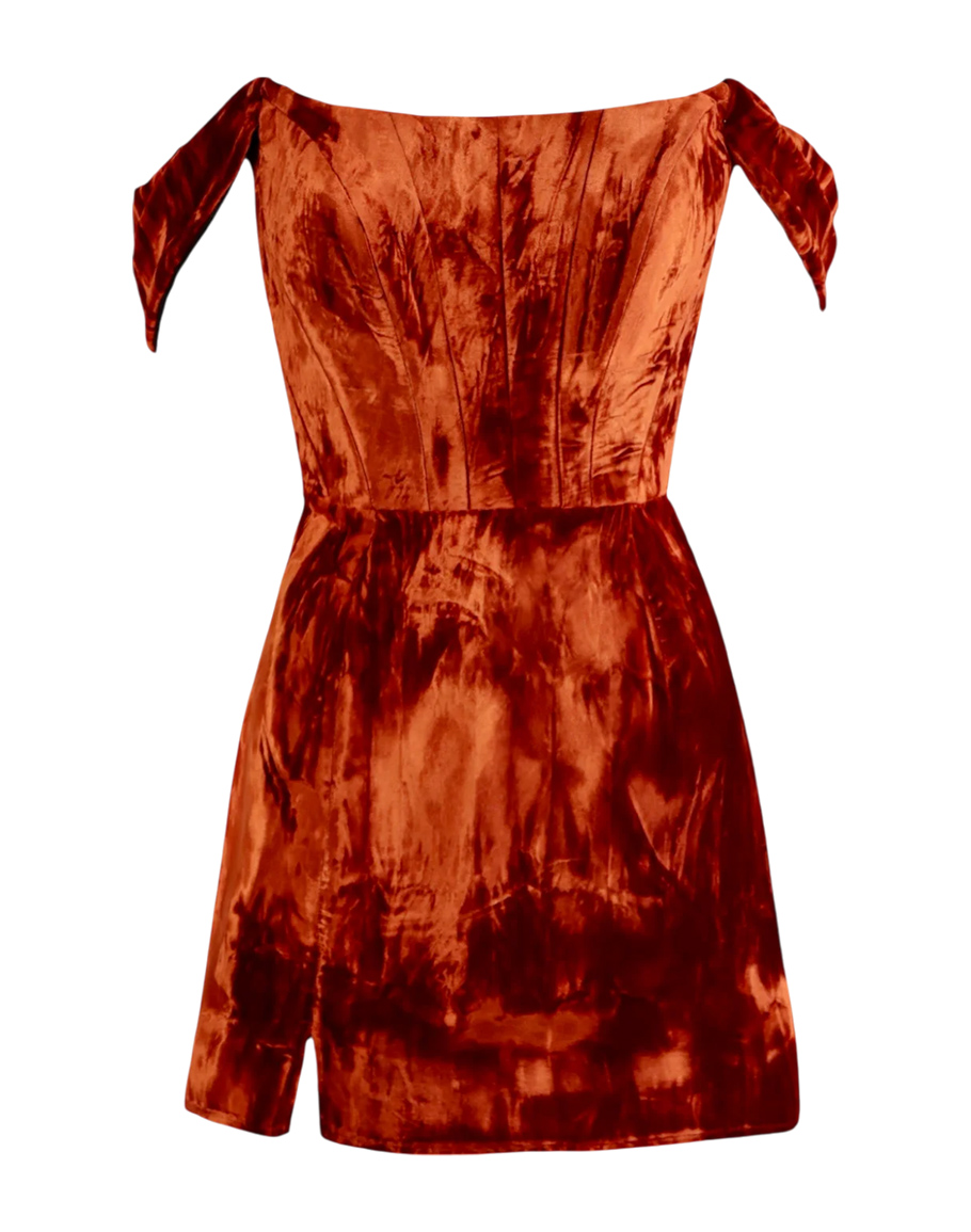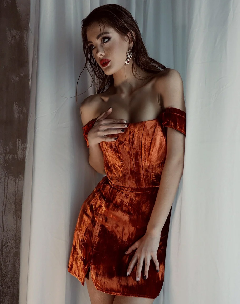Рокля FIRE в огнен оранжево преливащ се цвят изработена от полиестер. Кадифената оранжева рокля е с къса дължина, втален силует, гол гръб и елегантна цепка в долната част, която добавя движение. Квадратното деколте и нежно падналите ръкави придават женственост и финес, създавайки впечатляваща и модерна визия, идеална за специални поводи. Дамската оранжева кадифена къса рокля се предлага в размери XS, S и M.