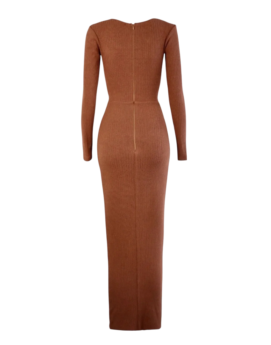 Рокля MOCHA KNITTING LONG в кафяв цвят изработена от дишаща и комфортна плетка, която се адаптира към тялото. Кафявата рокля носи елегантност, която не се нуждае от думи – извайва силуета и говори сама за себе си. Дългата силуетна рокля е с изрязан детайл на талията. Моделът е с дълъг ръкав, който балансира откритите линии и придава изисканост. Плетената еластична материя подчертава формите, без да стяга. Тази дълга плетена рокля е луксозен минимализъм – подходяща за вечерни излизания, коктейли или специални събития. Дамската дълга кафява рокля се предлага в размери XS, S и M.