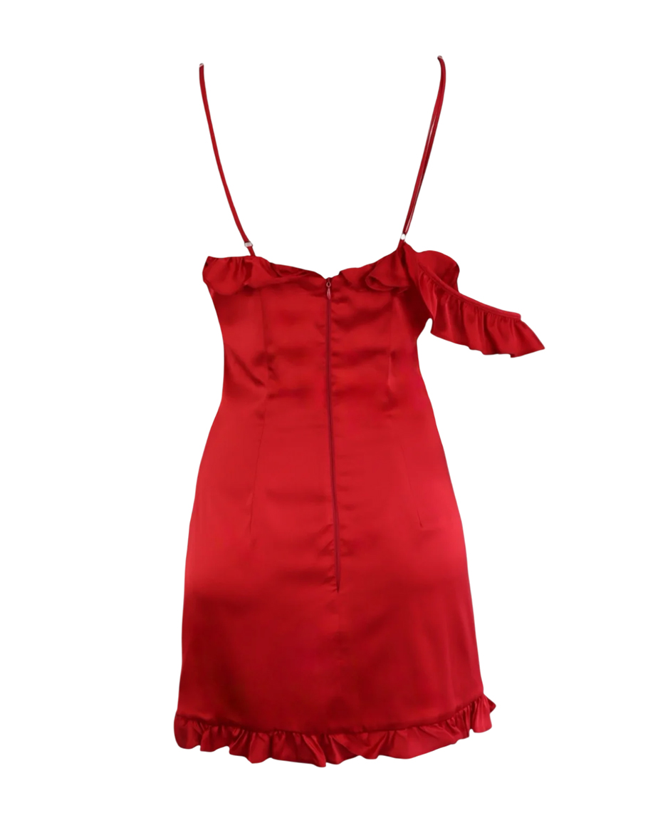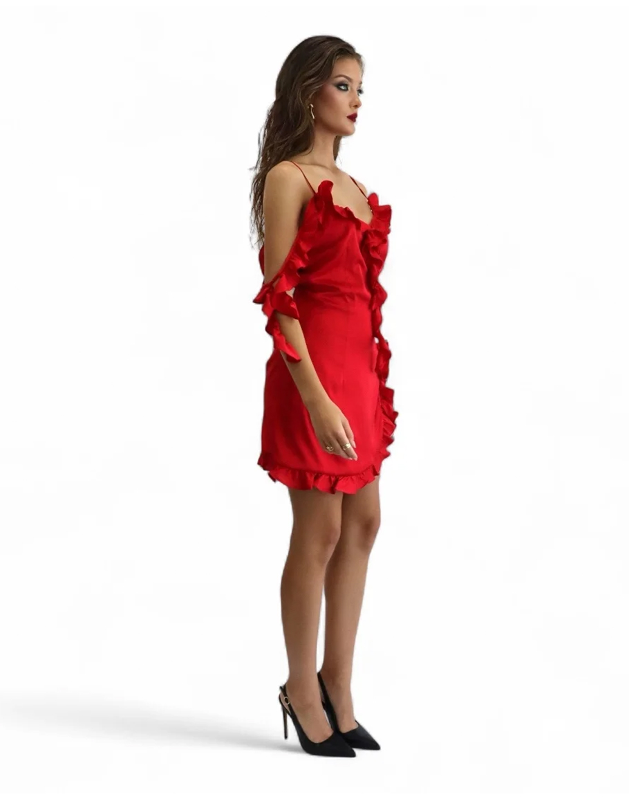 Рокля RED WAVES SATIN в красив червен цвят с къдри и сатенен блясък. Червената рокля е с къс силует с асиметрична дължина, подчертаваща краката. Роклята е с богати къдри по деколтето и полата за динамичен, флуиден ефект. Моделът е с тънки презрамки за изчистен и изкусителен акцент. Роклята е изработена от сатен с фин блясък, който отразява светлината. Червената рокля е перфектния избор за специален повод. Добавете аксесоари и любимите ви обувки и се насладате на момента. Дамската къса червена рокля се предлага в размери XS, S, M и L.