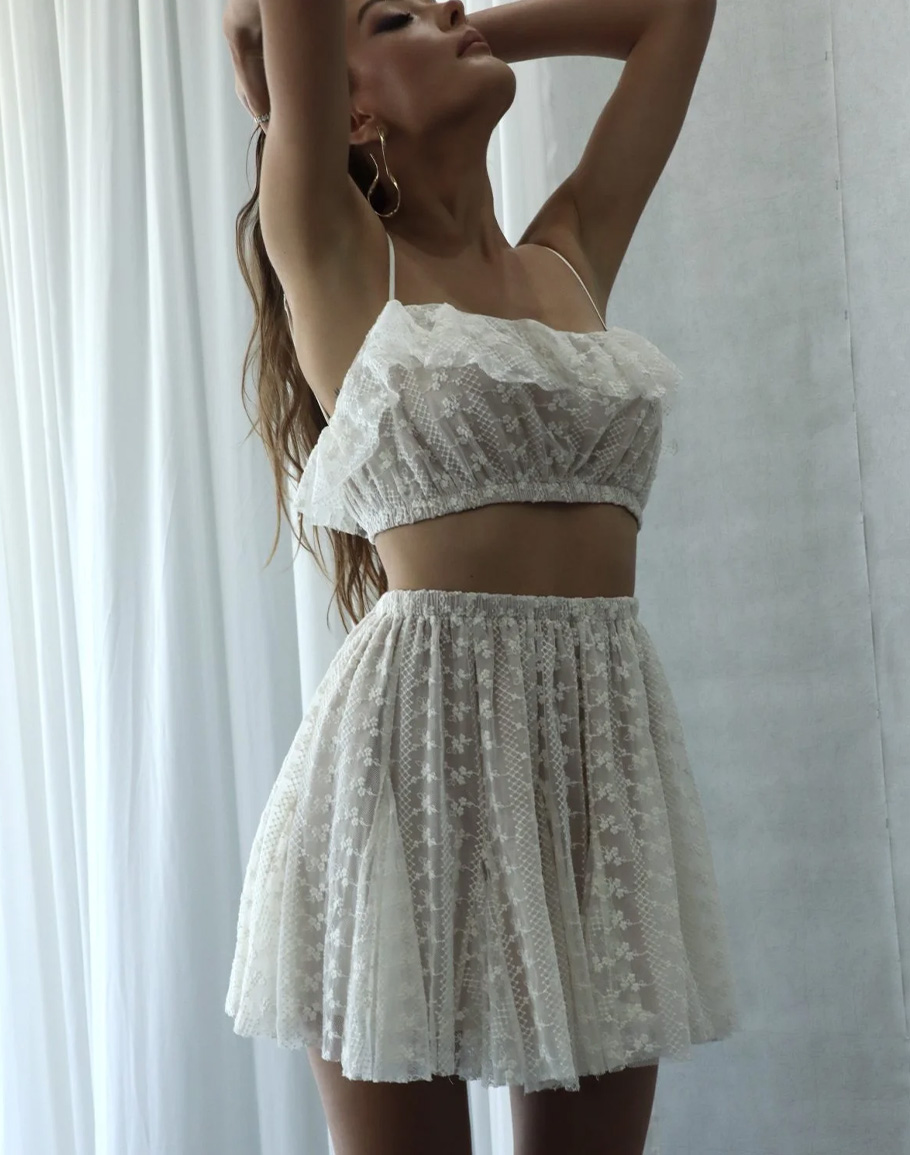 детайли: дантела, къса пола с висока талия и свободна кройка, кроп топ с тънки презрамки и ластик в долната част