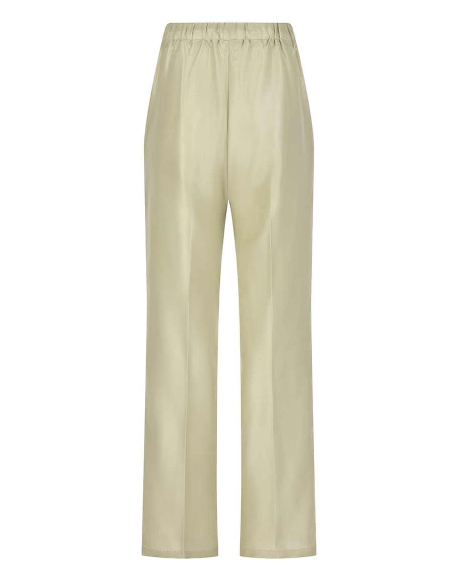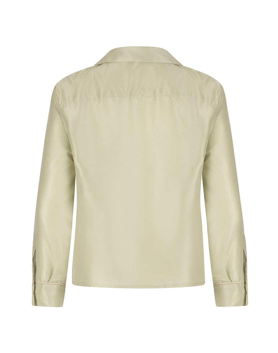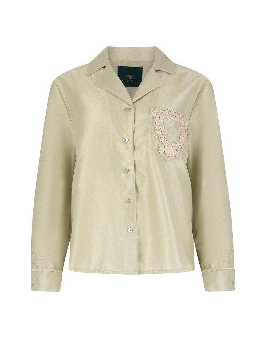 Сет CELERY GREEN PYJAMA изработен от студена коприна с фин, естествен блясък, сета впечатлява със своята нежност и изчистен лукс. Цветът на копринения сет — свеж, зелен нюанс с меки кремави отблясъци — носи усещане за лекота, хармония и естествена елегантност. Детайлите върху зеления копринен сет са ръчно изработен гайтан в цвят екрю придават фин контраст и подчертават деликатната женственост на визията. Кройката на сета е свободна, но прецизно структурирана, за да създава чиста линия и комфорт в движението. Ризата е с класическо падащо рамо и ръчно изработен елемент от гайтан върху джоба, допълнен от фини акценти върху маншетите и седефени копчета за изискан завършек. Панталонът е с висока талия и елегантен, леко разкроен силует, който издължава фигурата и създава усещане за ефирност. В страничните шевове на крачолите е вплетена лента от автентичен гайтан, която превръща всеки детайл в почерк на VEZA — израз на прецизност, ръчна изработка и съвременен прочит на традицията. Коприненият зелен сет може да бъде съчетан в изцяло елегантна, както и спортно-елегантна визия — комбинирайте с токчета или прави обувки/кецове в зависимост от повода и настроението ви. Дамският копринен зелен сет се предлага в универсален размер One-size.
