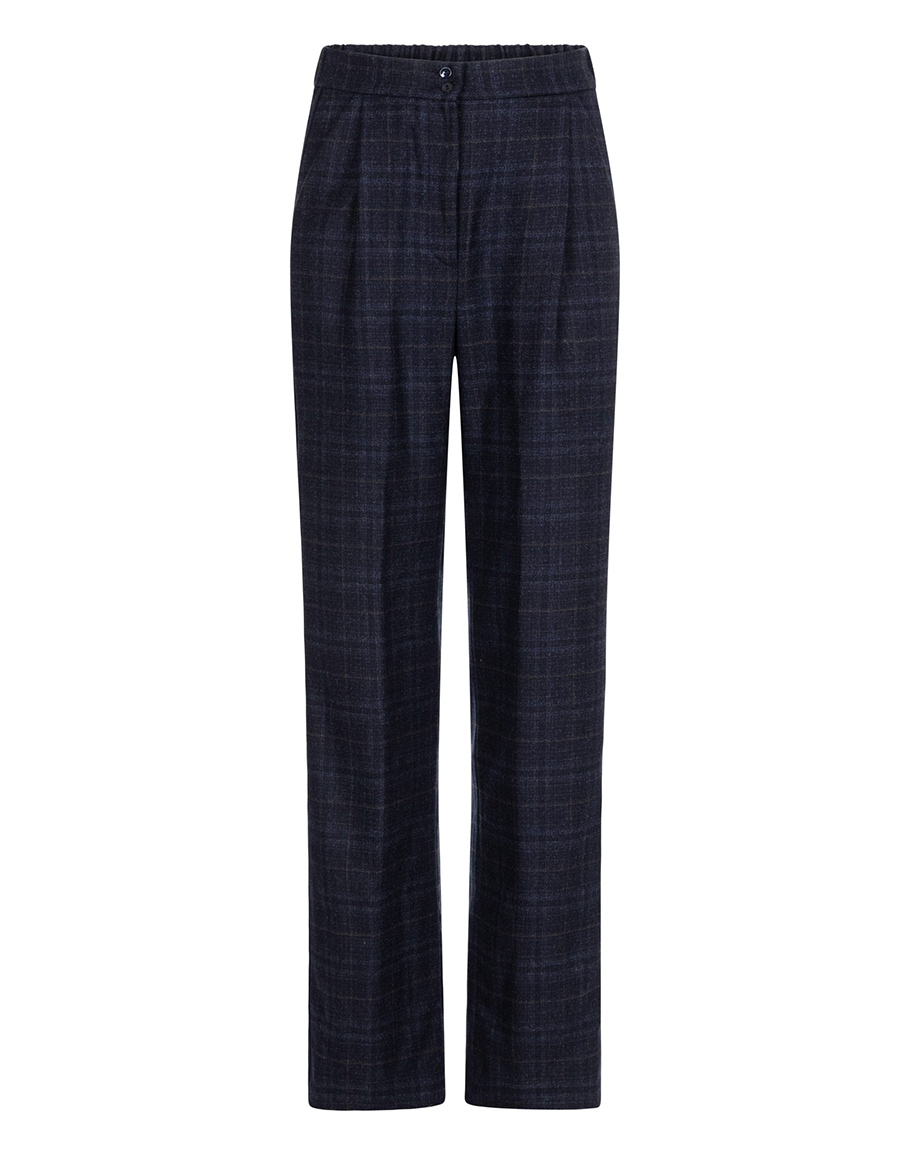 Сет NAVY GRACE PYJAMA изработен от висококачествена 100% студена вълна в тъмносиньо каре с фини кафеникави нюанси. Тъмносиният каре сет NAVY GRACE съчетава комфорт и изтънченост в перфектен баланс. Кройката на вълнения сет е свободна, но прецизно структурирана, така че да създава изчистена и елегантна линия, без да ограничава движението. Ризата е с класическо падащо рамо и ръчно изработен елемент от автентичен гайтан върху джоба, както и фини акценти по маншетите. Завършена е с деликатни седефени копчета, които подчертават нейния изискан характер. Панталонът е с висока талия и дълъг, леко разкроен силует, който издължава фигурата и създава усещане за лекота. В страничните шевове е вградена лента от автентичен гайтан — отличителен детайл и почерк на VEZA. Вълненият каре сет може да бъде съчетан в изцяло елегантна, както и спортно-елегантна визия — комбинирайте с токчета или прави обувки/кецове в зависимост от повода и настроението ви. Дамският вълнен тъмносин каре сет се предлага в универсален размер One-size.