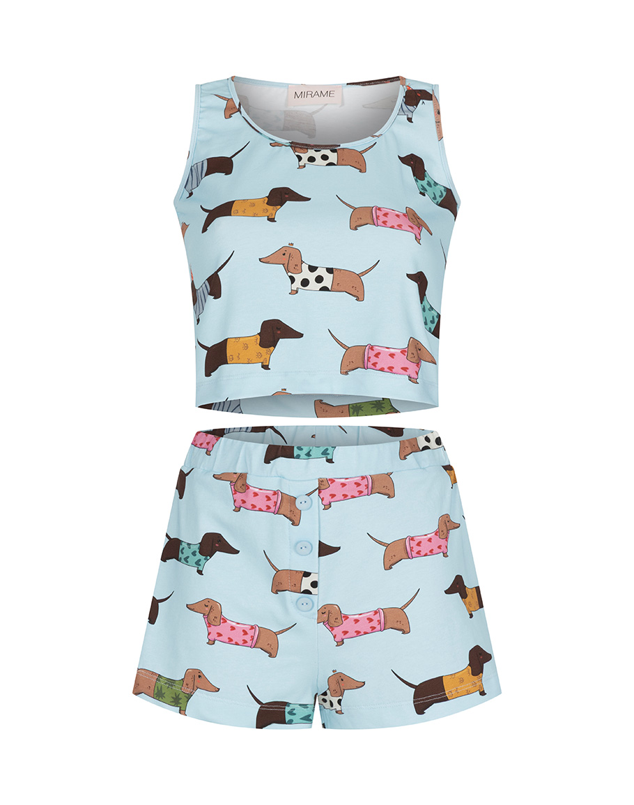 Сет от трико ДАКЕЛИ BLUE е свеж, закачлив и едновременно елегантен. Този памучен трикотажен сет от две части ще ви спечели с характер и комфорт. Скъсеният топ подчертава женствеността, а боксерките с декоративни копчета отпред носят модерна непринуденост. Дизайнерският принт с дакели положен върху сета, създаден от TO4KA SPOT специално за MIRAME, добавя артистична нотка към домашния ти стил. Идеален за почивка, уикенд у дома или дори като statement комплект за пътуване. Дамският син сет с принт дакели се предлага в размери S, M и L.