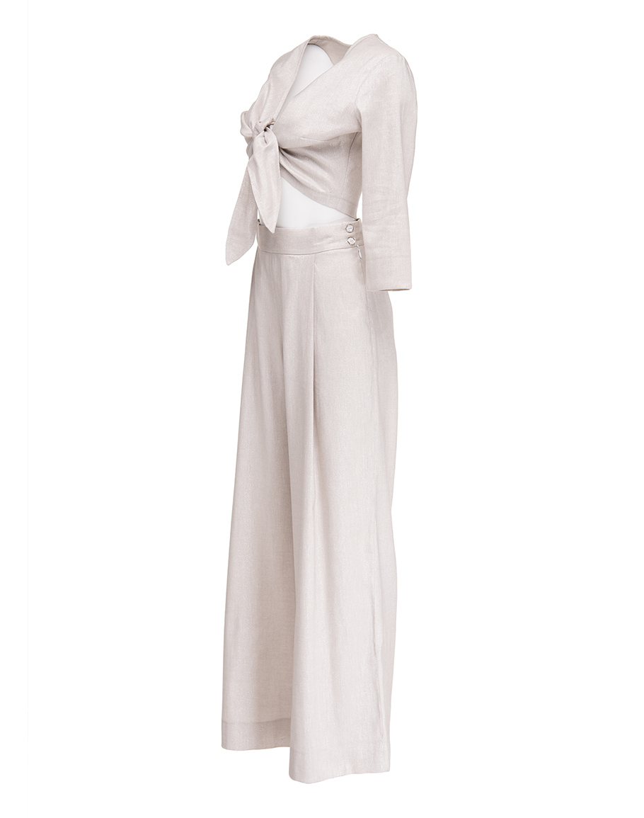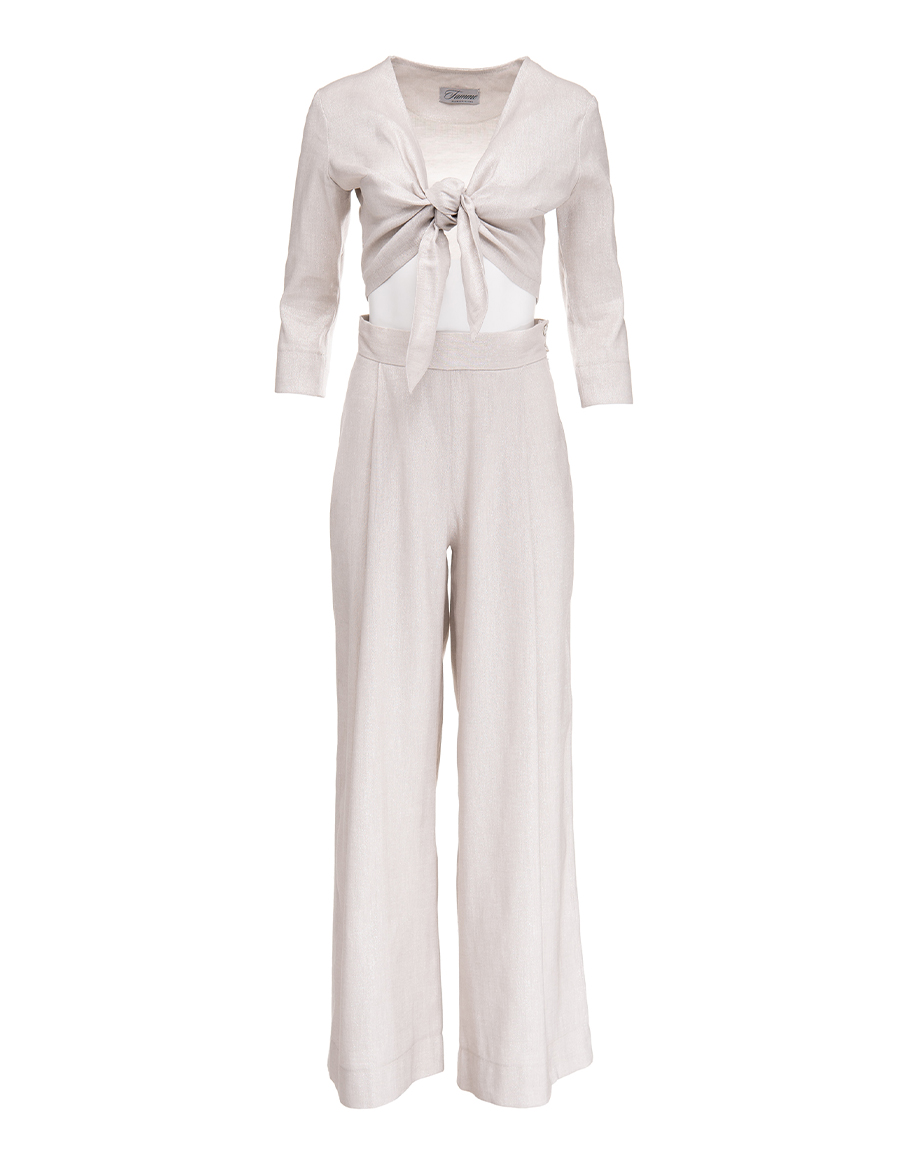 Сет SILVER MOON LIMITED от две части в деликатен перлено-сребрист нюанс. Долната част на сета е панталон с висока талия и свободна линия издължава силуета и носи усещане за лекота. Горната част на сребристия сет се завързва свободно отпред, като съчетава комфорт и женственост. Финият блясък по материята добавя изтънченост, напомняща сиянието на лунна нощ. Сет, който effortlessly съчетава комфорт и елегантност – подходящ за вечерни излизания, специални поводи или стилно ежедневие. Комбинирайте с прави обувки или токчета в зависимост от повода и настроението ви. Добавете аксесоари за финален щрих. Дамският сребристо перлен сет се предлага в размери S, M и L.