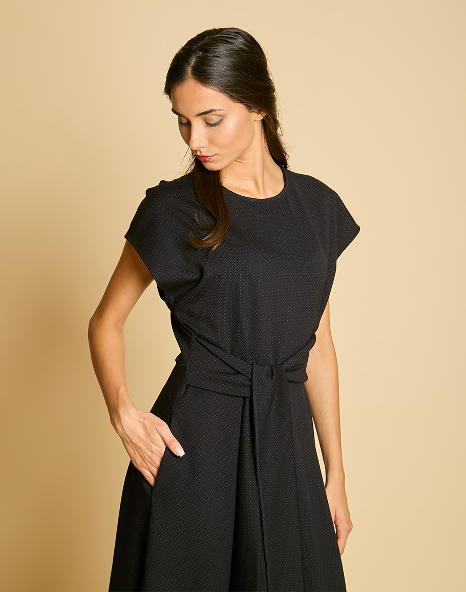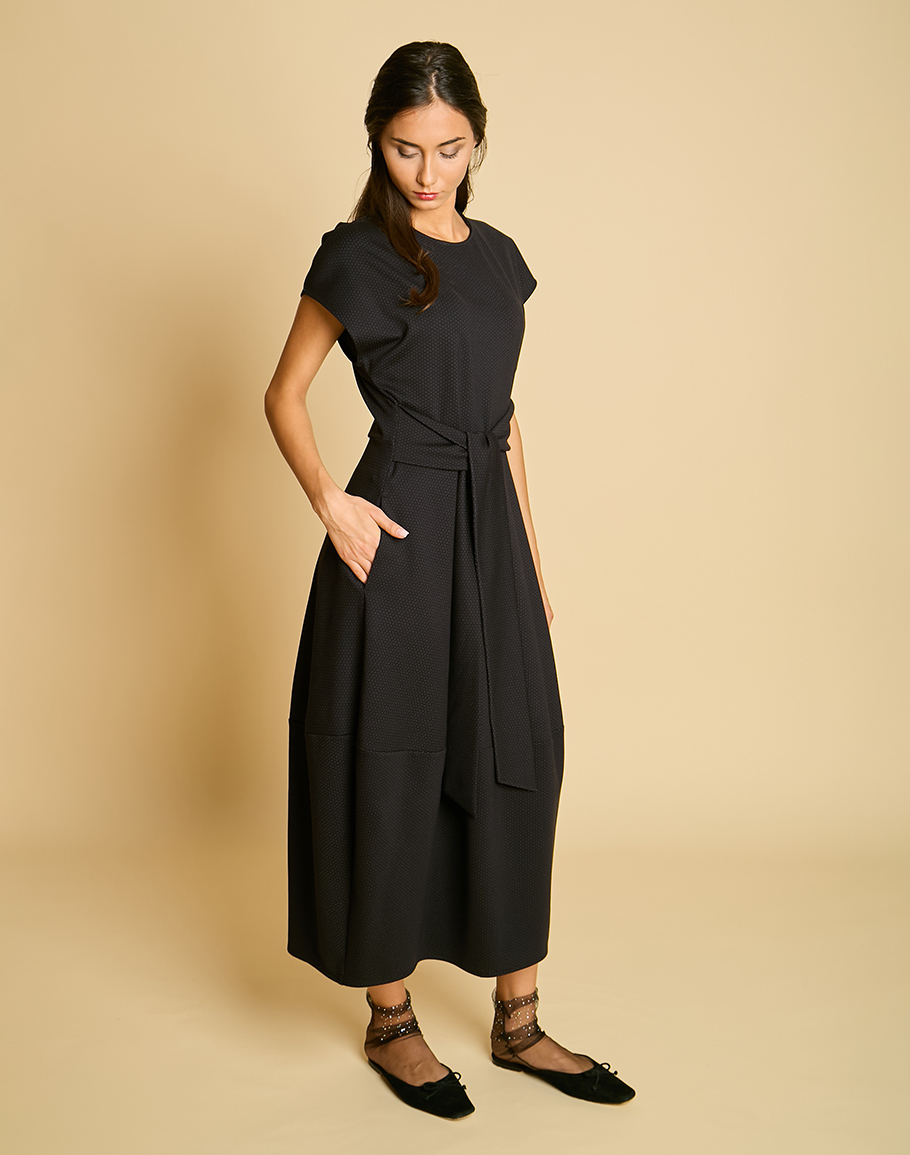 Скулптурна памучна миди рокля SAMMY BLACK DOTS в черен цвят на точки създаваща изразителен силует и нежно оформя фигурата. Черната рокля е изработена е от мек еластичен плат и има дискретни странични джобове, колан и структуриращи шевове. Закопчава се с цип на гърба. Детайлно изработеният дизайн на роклята подчертава талията и придава изтънчено излъчване. Черната миди рокля е подходяща както за офис визия, така и за елегантни събития. Материята на роклята осигурява комфорт и свобода на движението, а класическият десен на точки добавя игрив акцент към женствената кройка. Дамската миди черна рокля на точки се предлага в размери S, M и L.
