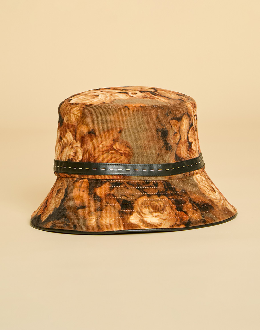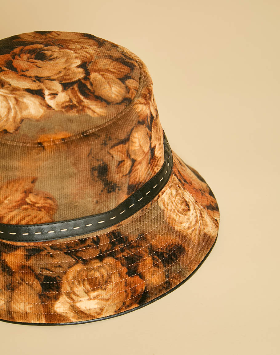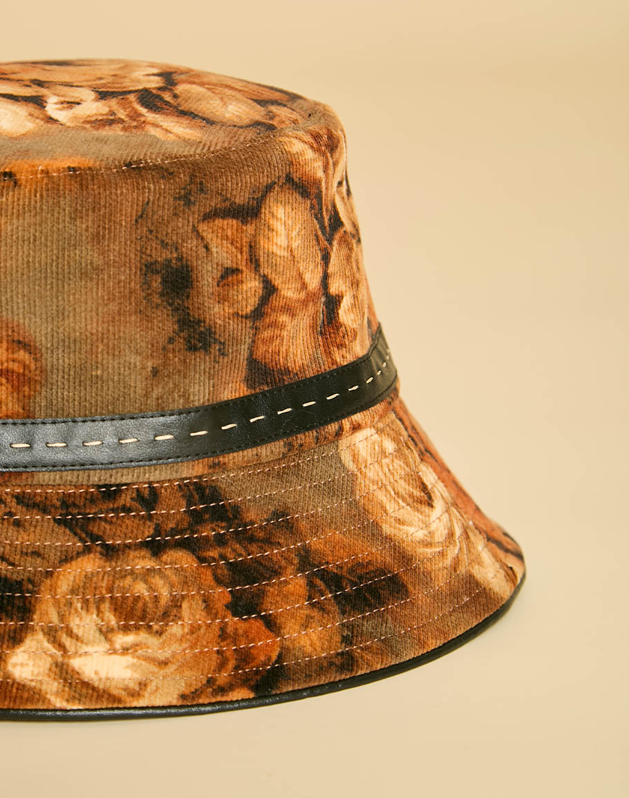 Кафидена шапка CANDICE изработена от памучно кадифе с красива есенна щампа. Класическа и елегантна, шапката e Bucket кройка. Удобна и лека това е шапка, която осигурява елегантна визия през преходните месеци. Подходяща както за елегантна, така и за спортно-елегантна визия. Дамската флорална кадифена бъкет шапка се предлага в размери S, M и L.