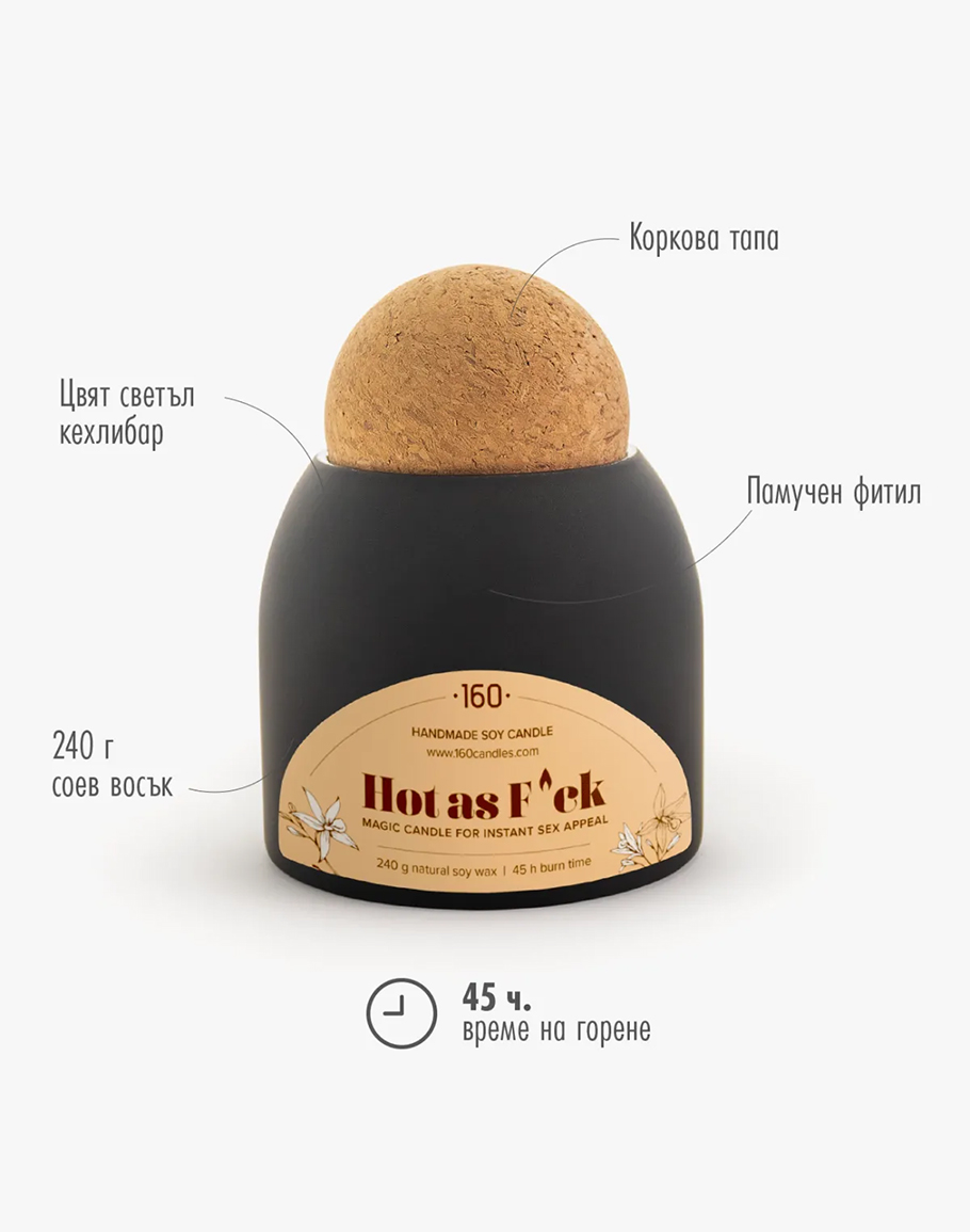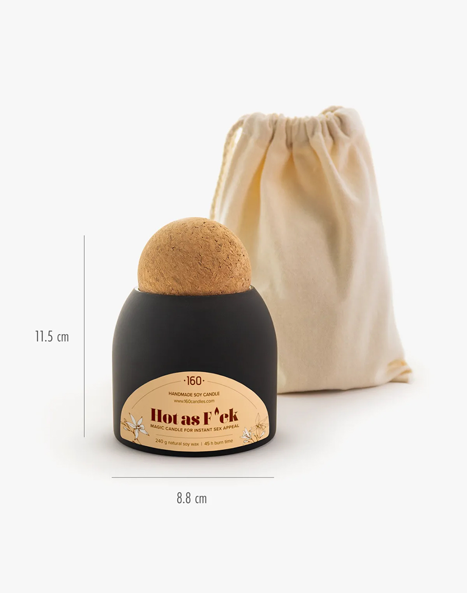Свещ HOT AS F*UCK ръчно изработена с аромат на мигновена самоувереност и неустоим сексапил. Свещта е magic candle for instant sex appeal. 160 CANDLES съчетават елегантен дизайн с натурални съставки, за да създадем това ароматно бижу, което би стояло елегантно във всеки дом. Свещта е ръчно излята в стъклен съд в цвят светъл кехлибар с коркова тапа във формата на топка. Елегантният му дизайн го прави подходящ за повторно използване като съд за съхранение, ваза или каквото ви хрумне. Соевата свещ е перфектна за подарък.