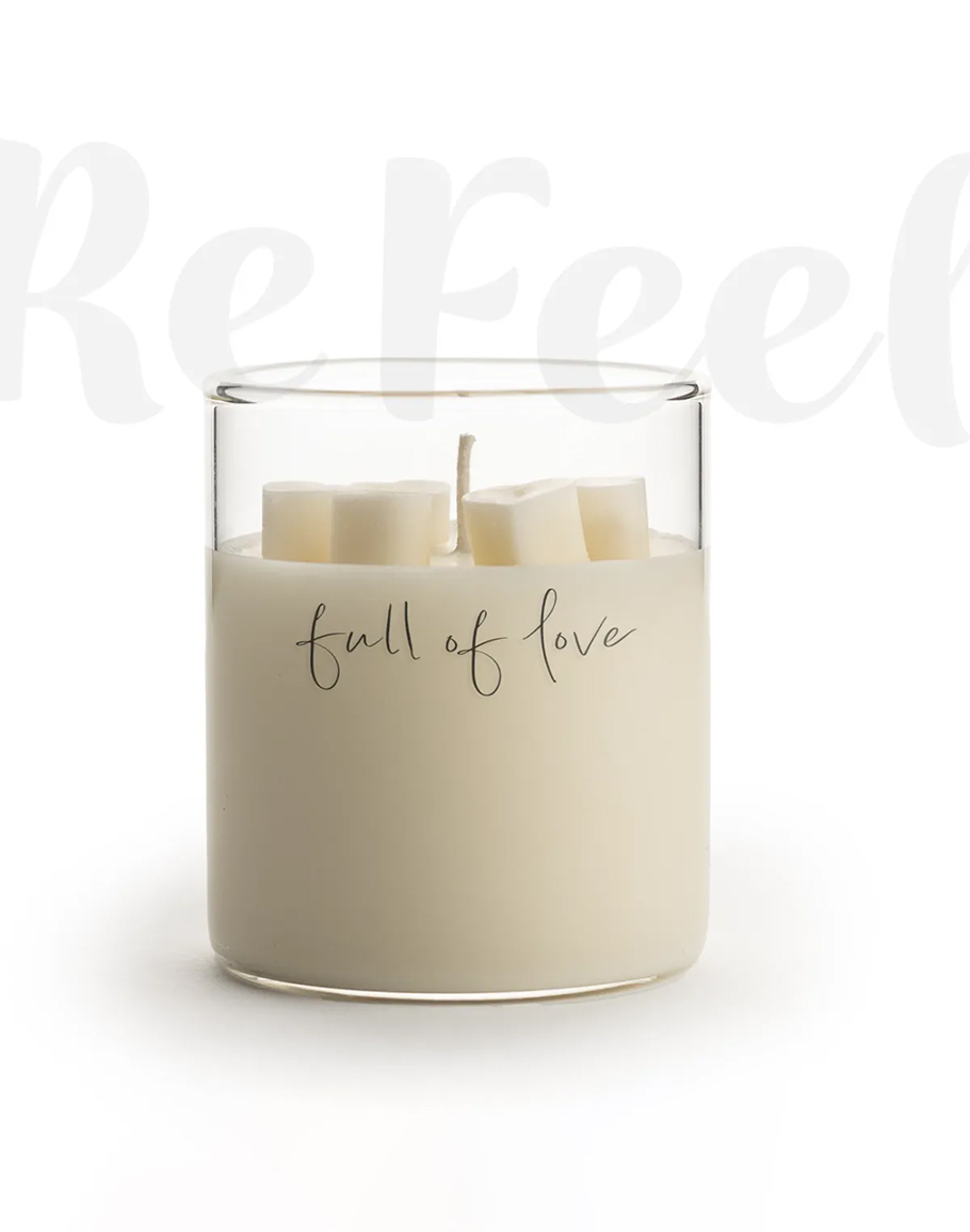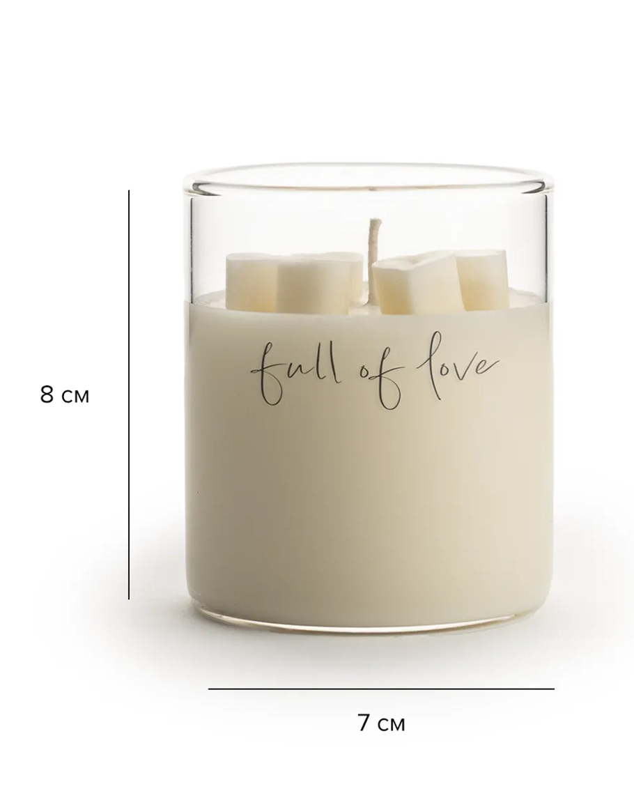 Свещ със сърца FULL OF LOVE пълна с любов. Изразете любовта си с натурален подарък и избягайте от клишето на плюшените сърца. Ароматът на свежестта на ябълка е във завладяваща комбинация с топлия аромат на дърво. Красив цветен аромат с нежни нотки на сладост. Свещта е ръчно изработена от 100% соев восък с време на горене 40 часа. Свещ със сърца FULL OF LOVE е перфектният избор за подарък за любимия ви човек.