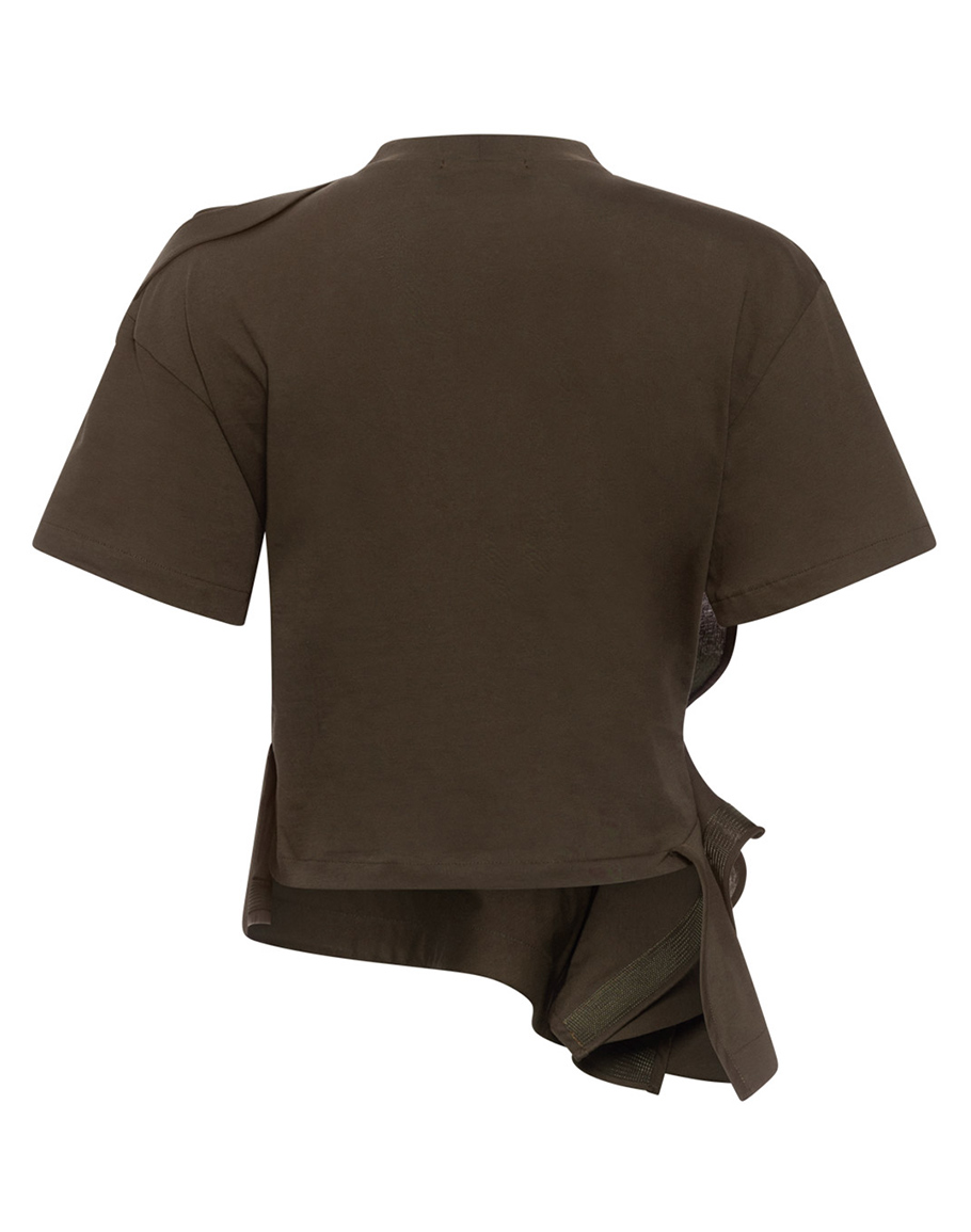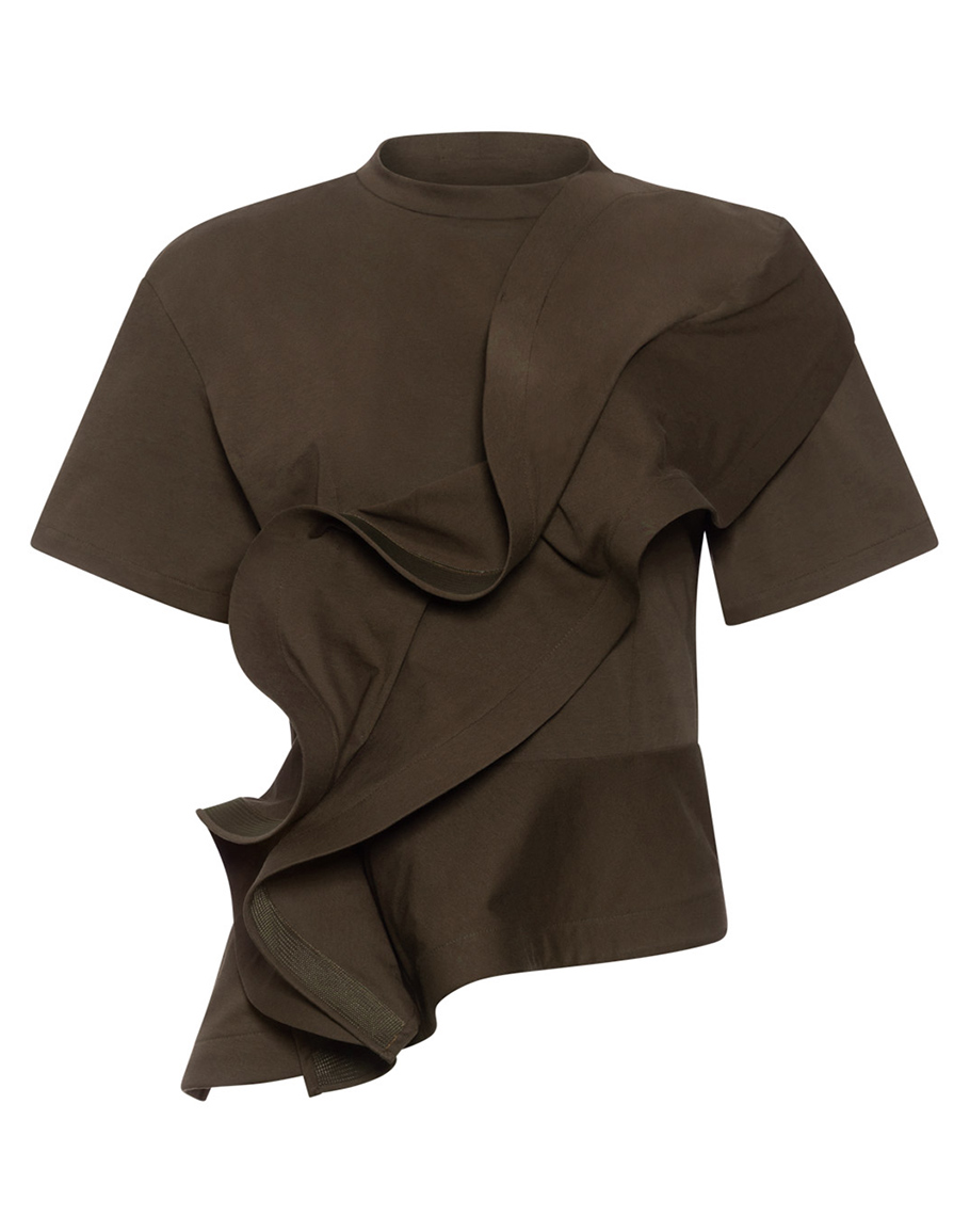 Тениска ECHOES OF FORM BROWN в кафяв цвят изработена от 100% памук. Кафява тениска преосмисля класиката. С уникални форми в предната част, тениската не е просто обикновен артикул – тя е икона. Част от дизайна, която удължава предната част, придава на кафявата тениска модерен, асиметричен вид, съчетавайки комфорт с силно изразен стил. Моделът е ръчно изработен. За една съвършенна KESEI визия, съчетайте с моделите на марката. Дамската кафява тениска се предлага в размери XS, S, M и L.