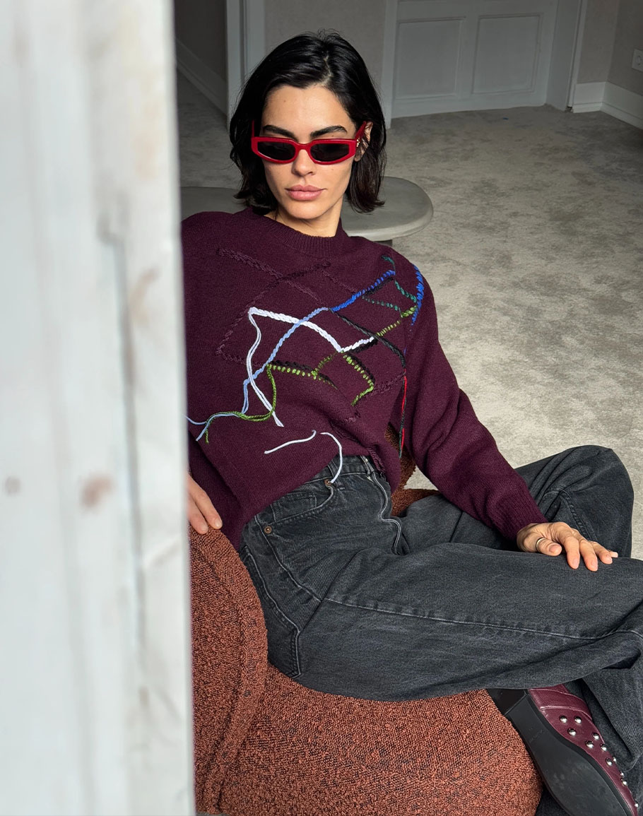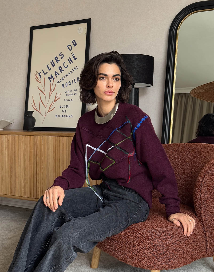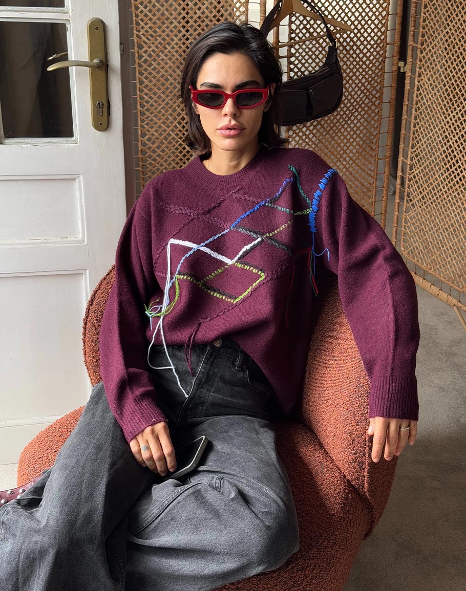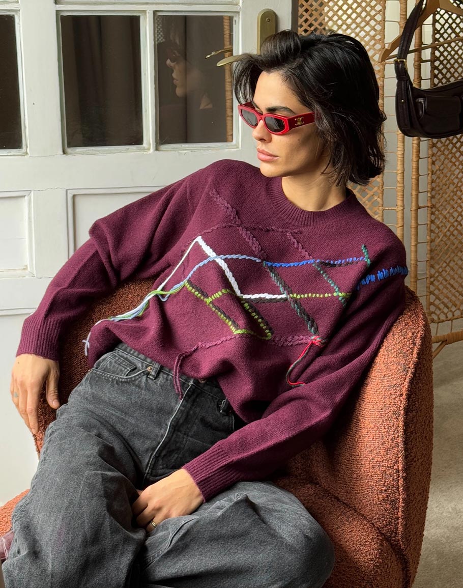 Вълнен пуловер MARGOT в красив бордо цвят изработен от фина селектирана агнешка вълна. Със своите супер фини вълнени влакна, бордо пуловерът създава изключително меко усещане и висока способност за задържане на топлина. Вълненият бордо пуловер е декориран с ръчно изработени абстрактни детайли в живи цветове, които придават допълнителен чар на всичко, с което го съчетаете. Моделът е с овално деколте и свободна кройка, което създава една удобна, стилна и невероятна визия. Дамският вълнен бордо пуловер се предлага в размери XS, S, M, L и XL.