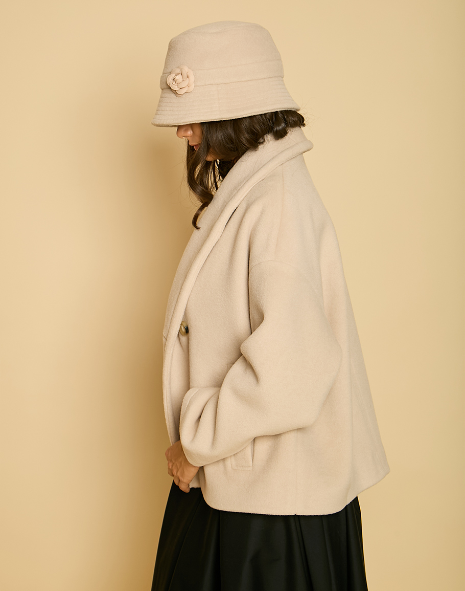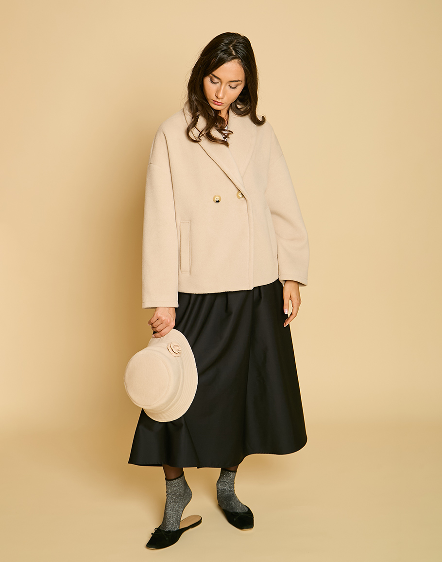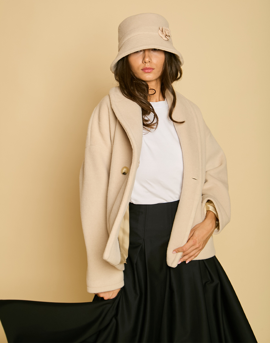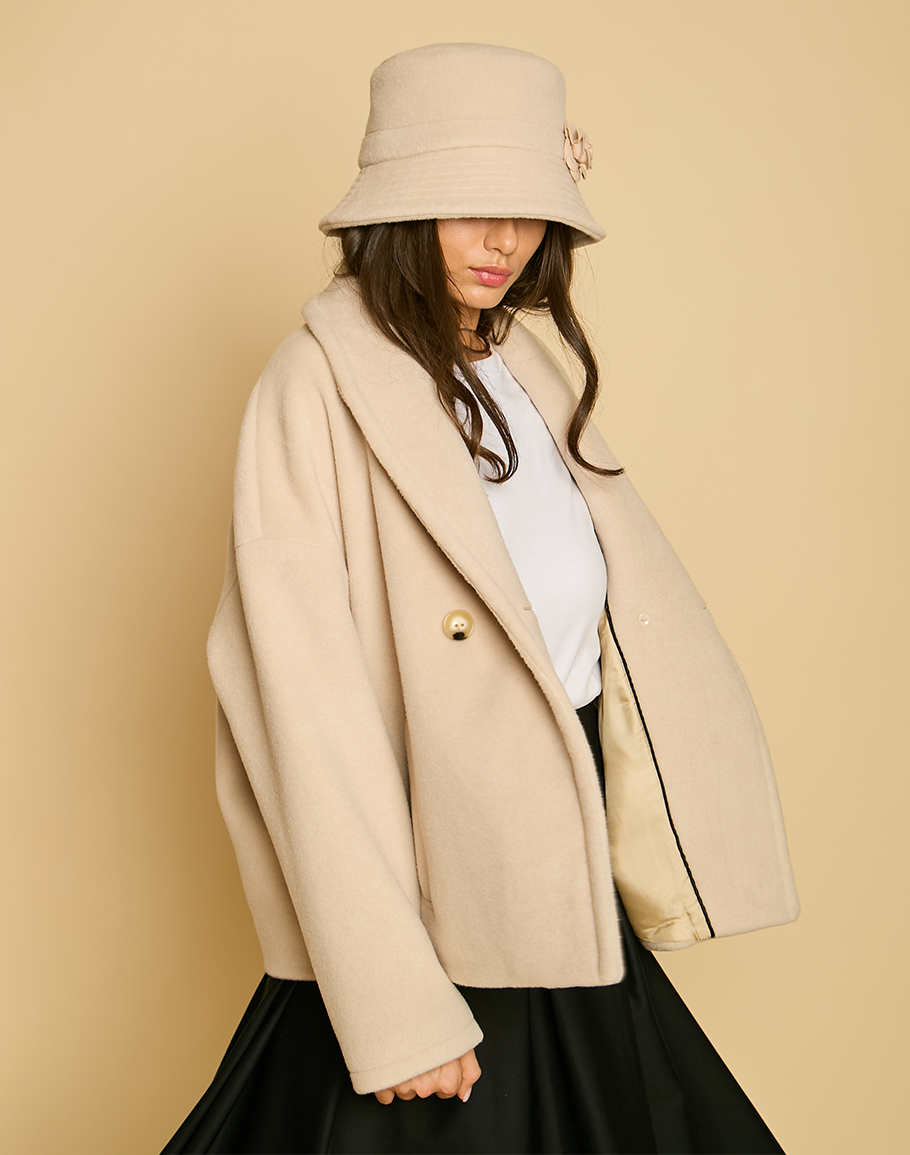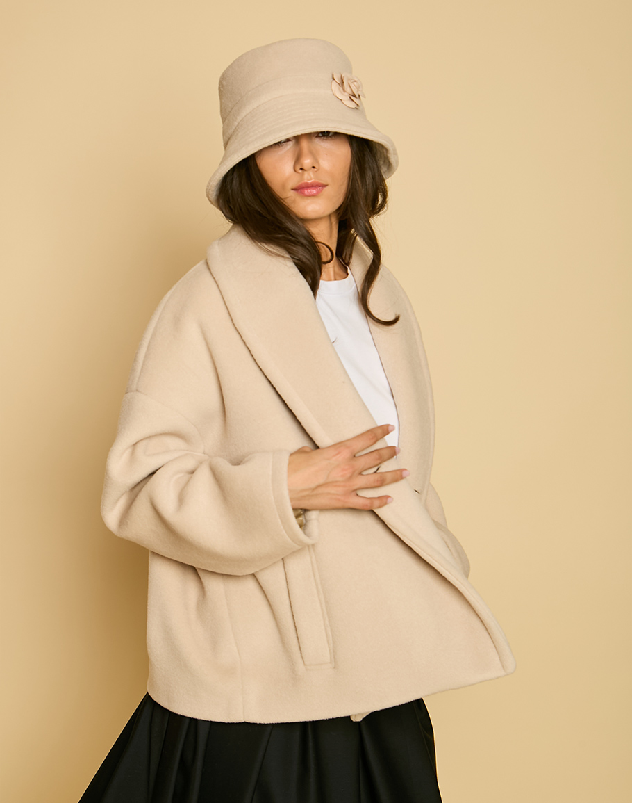 Вълнено късо палто GABRIEL ECRU в екрю цвят с оувърсайз силует и права кройка. Късото екрю палто е двуредно изработно от висококачествена вълна с широка шал-яка, която придава изтънчен и съвременен вид. Палтото разполага с джобове с филетки и е напълно подплатен за допълнителен комфорт и топлина. Закопчава се с копчета в предната част. Универсален и стилен избор, късото екрю палто е подходящо за както за ежедневието, така и за по-официални визии – перфектното допълнение към всяка градска есенно-зимна визия. Дамското вълнено късо екрю палто се предлага в размери S, M и L.