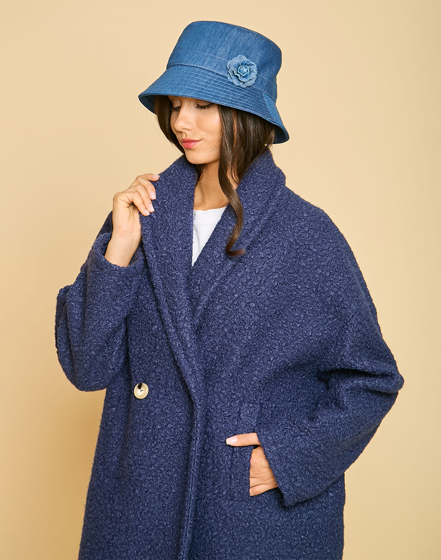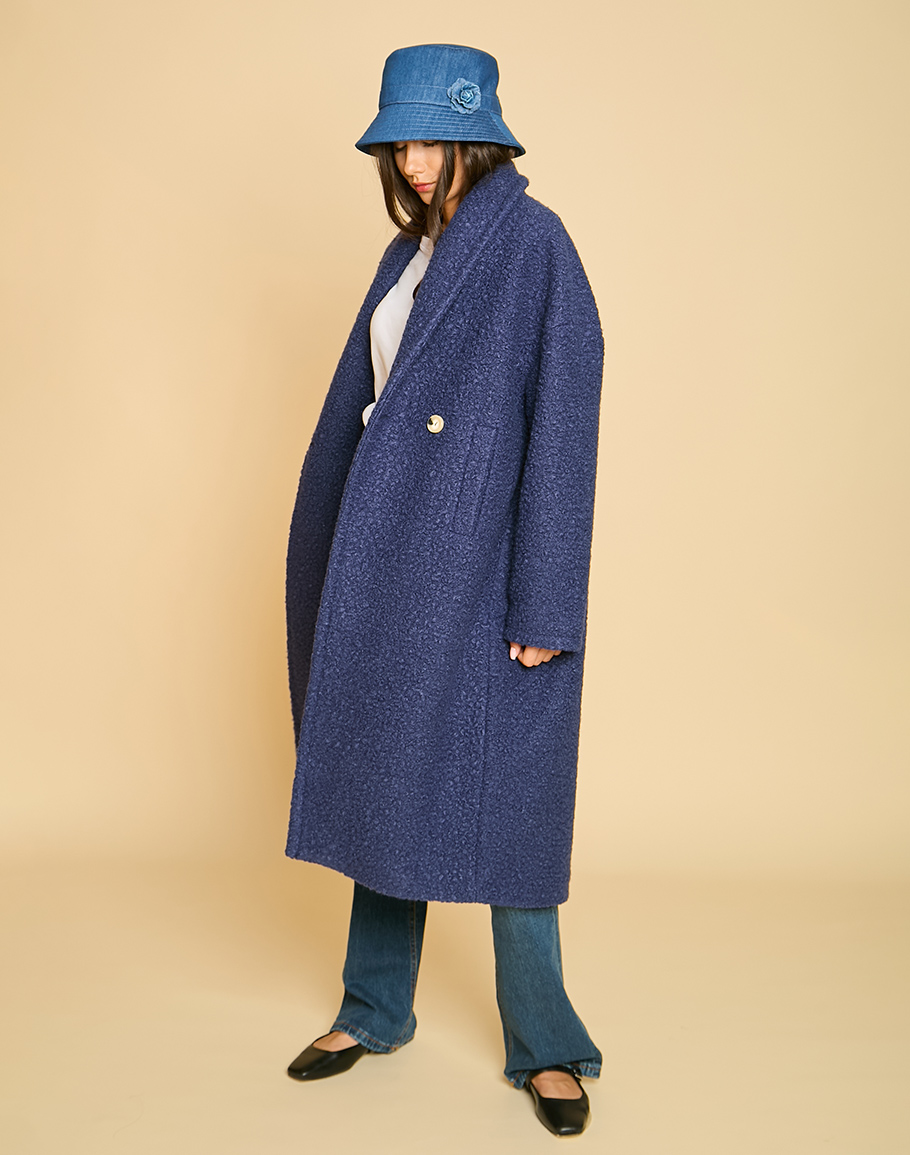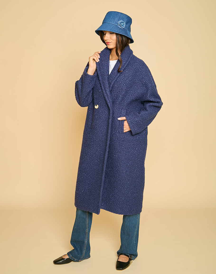 Вълнено палто ROBBIN в неустоим цвят боровинка с оувърсайз кройка. Лилавото палто е изработено от вълнено букле с права кройка, двуредно, с джобове с филетки и с широка шал-яка. Палтото е подплатено, а закопчаването му е с копчета в предната част. Вълненото палто съчетава уют и стил, идеално както за градски разходки, така и за по-официални визии през студените дни. Луксозната текстура и наситеният цвят придават изискан завършек на всеки тоалет. Дамското вълнено боровинково палто се предлага в размери S, M и L.