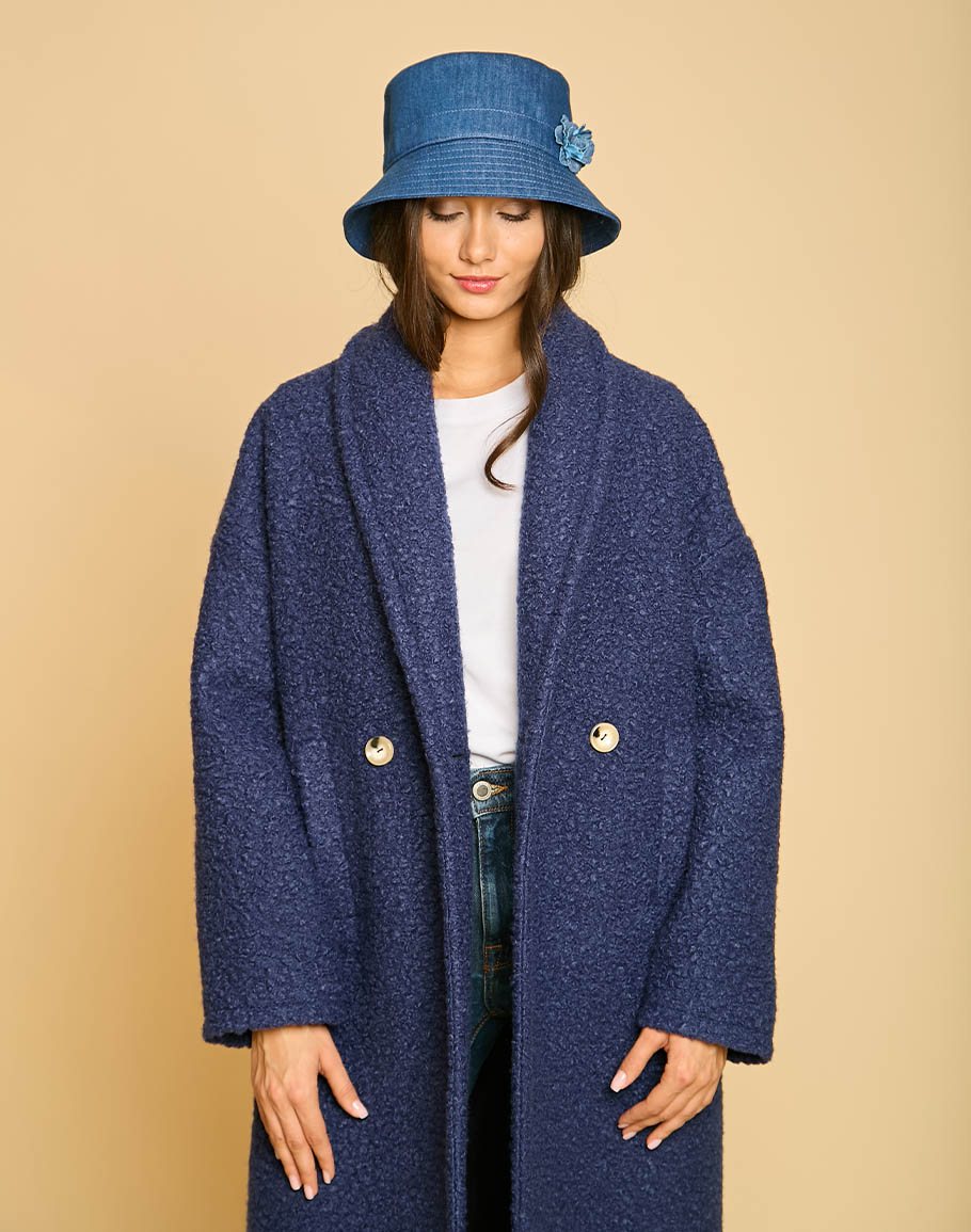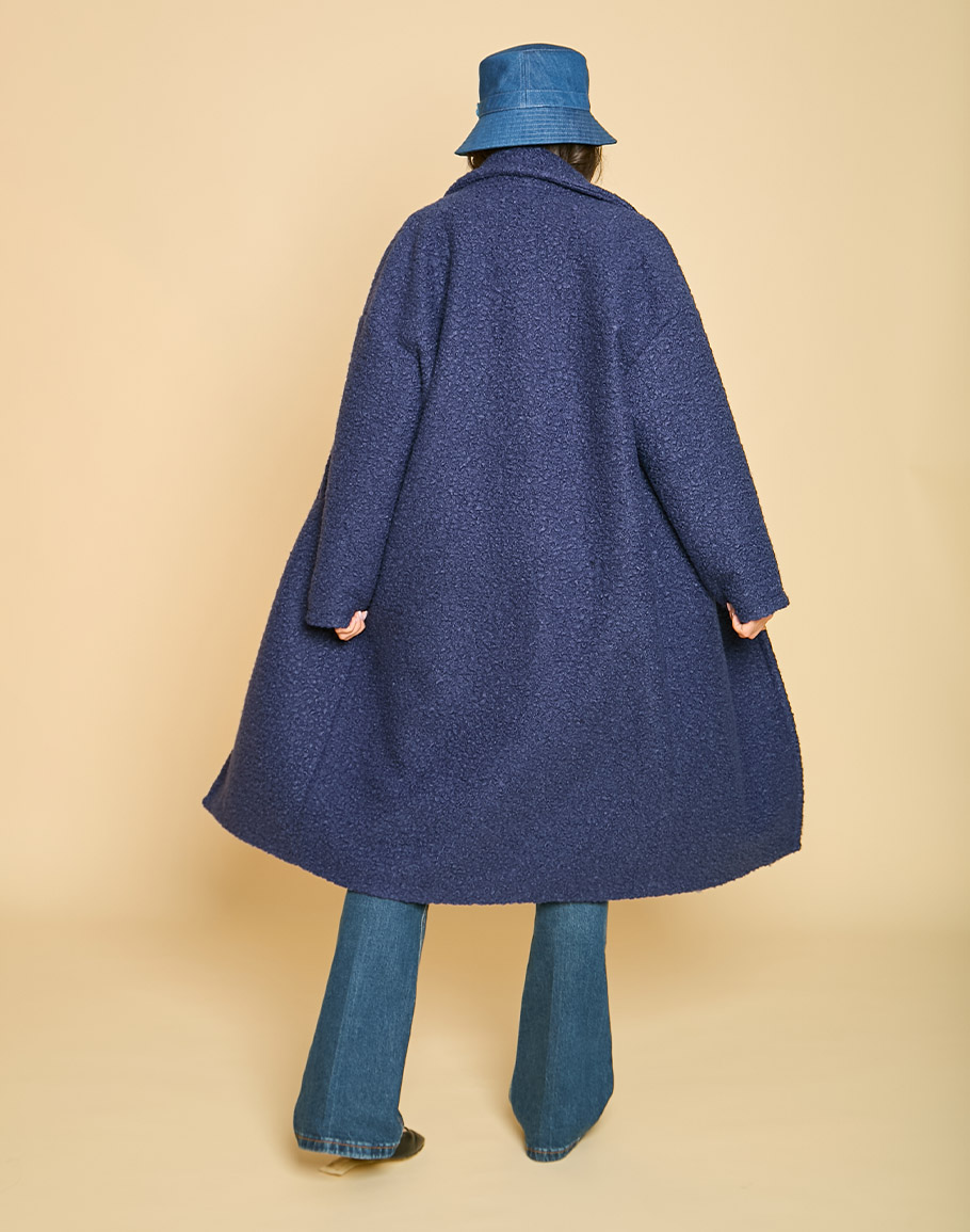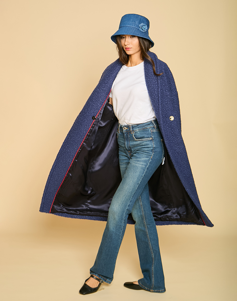 Вълнено палто ROBBIN в неустоим цвят боровинка с оувърсайз кройка. Лилавото палто е изработено от вълнено букле с права кройка, двуредно, с джобове с филетки и с широка шал-яка. Палтото е подплатено, а закопчаването му е с копчета в предната част. Вълненото палто съчетава уют и стил, идеално както за градски разходки, така и за по-официални визии през студените дни. Луксозната текстура и наситеният цвят придават изискан завършек на всеки тоалет. Дамското вълнено боровинково палто се предлага в размери S, M и L.