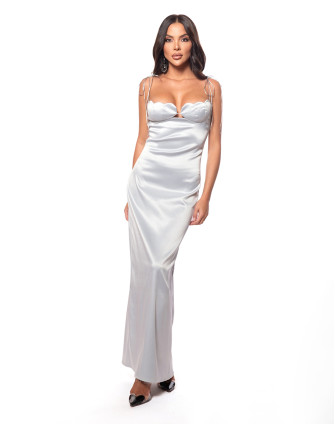 КупиДълга рокля GLAM в сребрист цвят изработена от 100% сатен. Дългата сребриста рокля е създадена ..