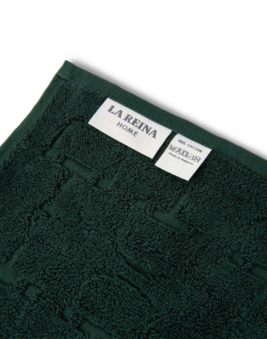 Велурена кърпа за баня GREEN 40X60 в зелен цвят изработена от 100% висококачествен памук за едно меко докосване. Малката зелена кърпа за баня е с еклузивен дизайн с детайли на LA REINA. Моделът се отличава с висока абсорбираемост и плътност, които осигуряват комфорт и бързо подсушаване. Малката зелена велурена кърпа е с размери 40X60 cm, плътен 500 GSM и със сетифициран Oeko-Tex® стандарт.