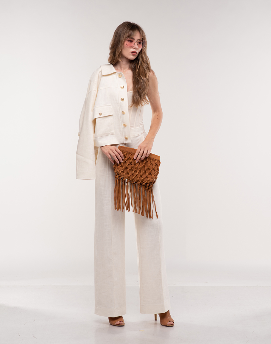 Дизайнерско яке на българския бранд Famme. Famme е моден бранд, създаден с цел да внесе изящество и елегантност. Мисията на Famme е да вдъхновява всяка дама да се чувства красива и нежна, докато изразява своя уникален стил и личност. Famme съчетава класическа елегантност с модерен усет, за да създаде вечни и изискани облекла. С Famme всяка дама може да открие своя уникален стил и да се почувства красива, вдъхновена и уверена.